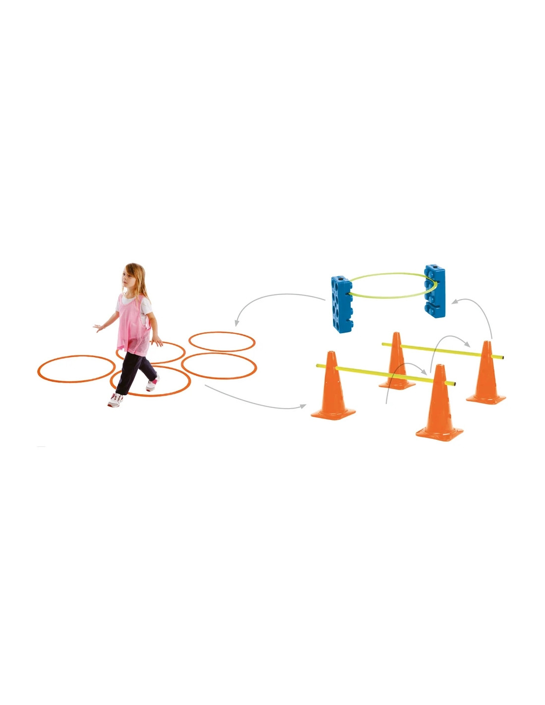 Grâce à la diversité des éléments inclus, ce kit permet de construire des parcours de motricité structurés, combinant franchissements, passages ciblés et déplacements guidés. Il s’adapte facilement aux différents niveaux et objectifs pédagogiques.
