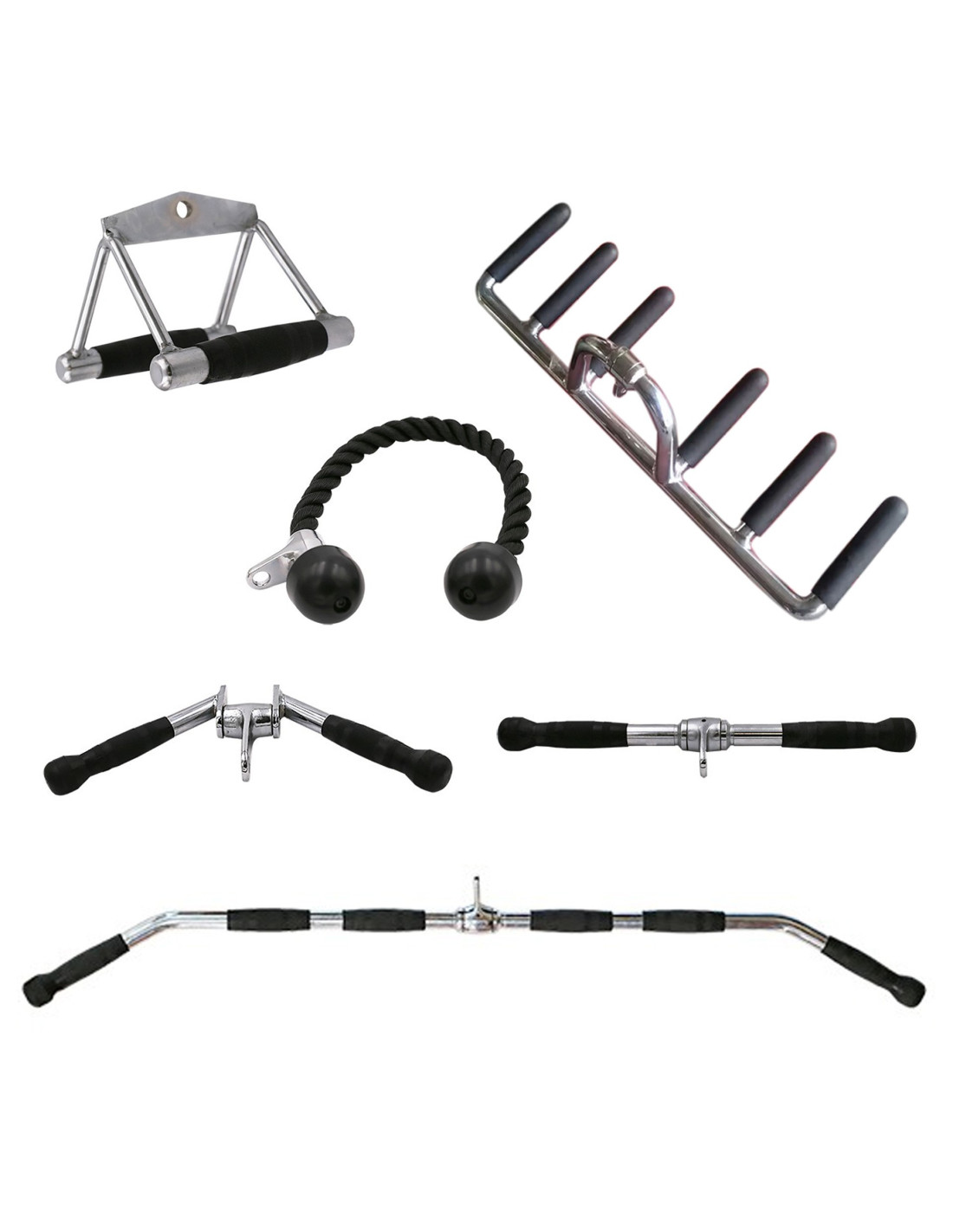 Ce kit regroupe les accessoires les plus utilisés en musculation pour les exercices de tirage et d’extension. Il permet une grande variété de mouvements : tirages dorsaux, extensions triceps, curls biceps, rowings, tirages horizontaux, travail en prise large, serrée ou neutre.