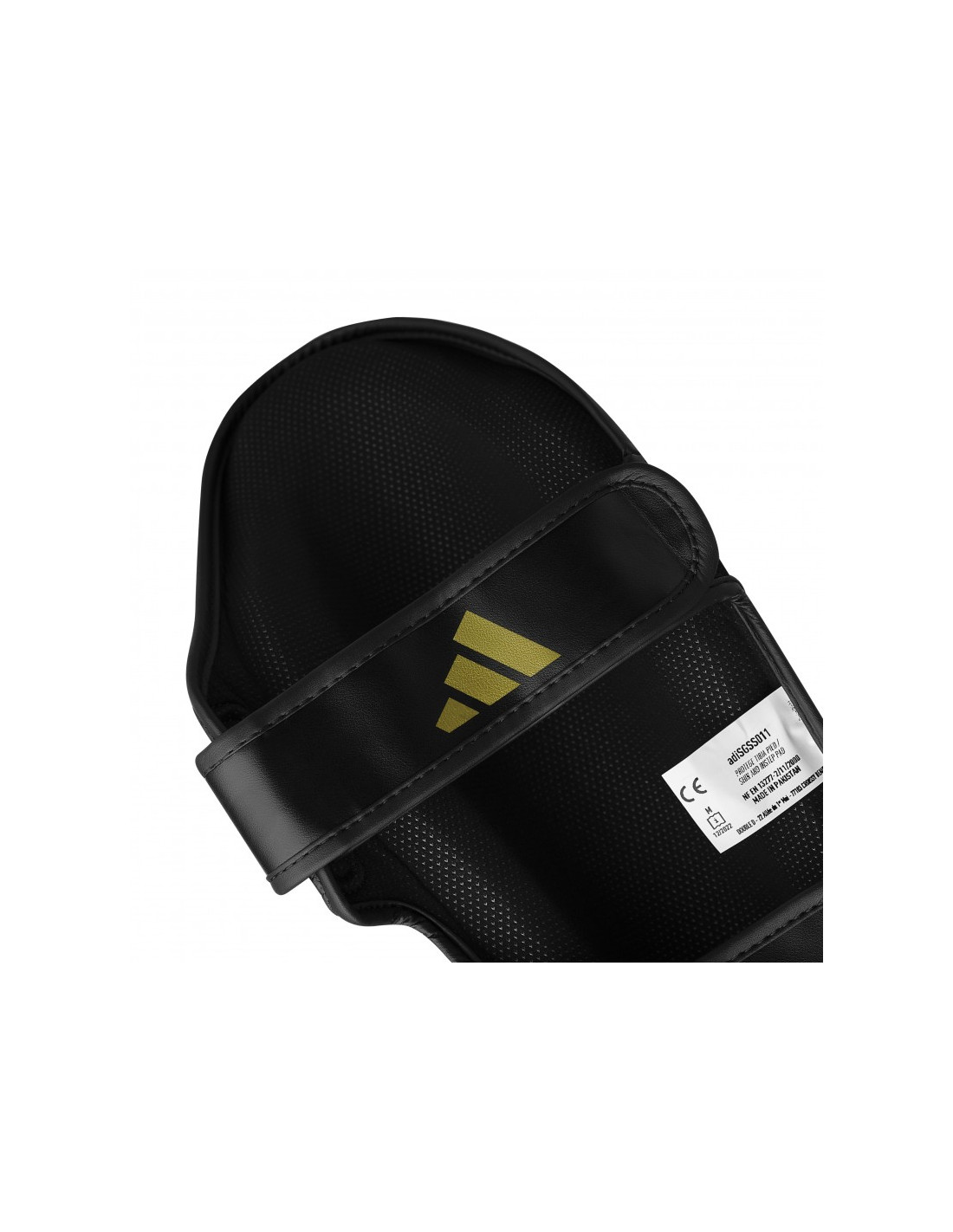 Protège-tibias et pieds adidas pour sports de combat, conçus en polyester recyclé avec rembourrage en mousse EVA. Disponibles en noir, bleu, rouge, tailles XS à XL.